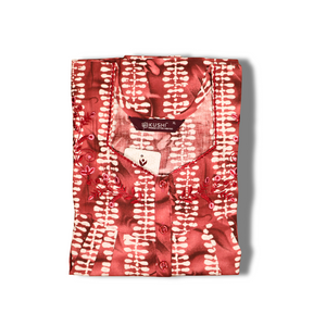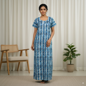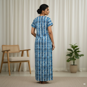 This premium cotton nighty features a vertical tie-dye stripe pattern in calming blue and white hues. Designed for comfort and breathability, it offers a relaxed fit with short sleeves and a modest round neckline. Perfect for all-day home wear, the fabric ensures a soft, smooth touch against the skin while maintaining durability after multiple washes.