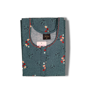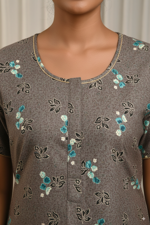 Elegant Brown Cotton Nighty designed with all-over aqua blue and white floral prints. Made from breathable cotton, this nighty provides day-long comfort with a stylish look. Perfect for home and sleepwear.