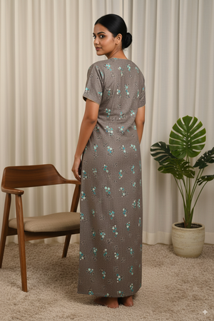 Premium Cotton Brown Nighty – Aqua & White Floral Print