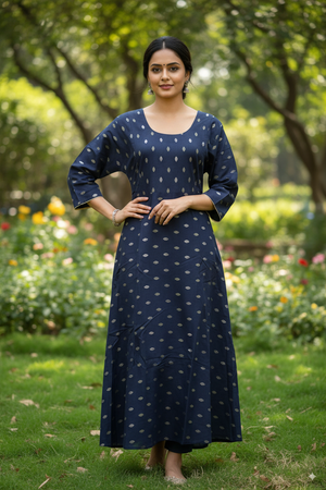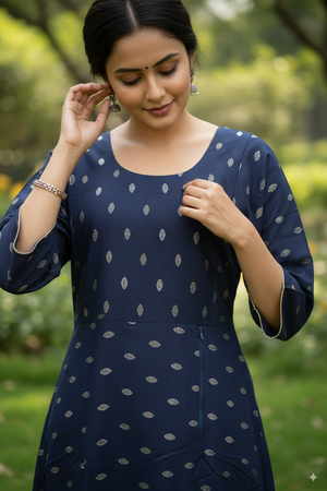Exude grace and comfort with the Kushi Premium Cotton Kurti, designed in a rich navy blue base adorned with subtle traditional prints. Crafted from soft breathable cotton, this kurti features a round neckline, 3/4th sleeves, and an A-line silhouette, making it versatile for office wear, festive gatherings, or casual outings. Pair it with leggings, churidar, or palazzos for a refined ethnic look.