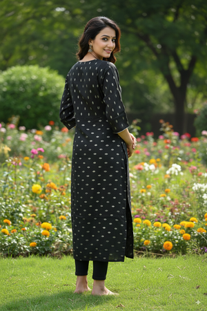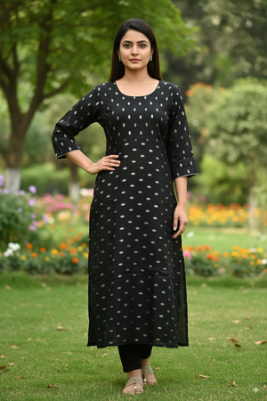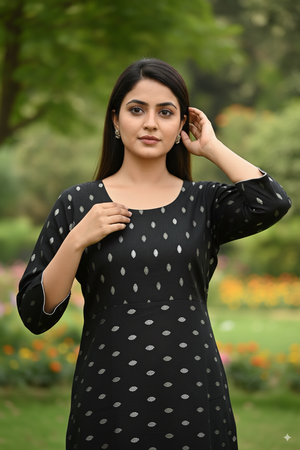 Step out in timeless elegance with the Kushi Premium Cotton Kurti, crafted in a classic black base with subtle silver printed motifs. Designed from soft breathable cotton, this kurti features a round neckline, 3/4th sleeves, and a flattering A-line silhouette, making it versatile for casual outings, office wear, or festive occasions. Pair it with leggings, churidar, or palazzos for a graceful ethnic look.