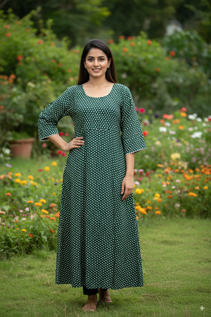 Bring a playful charm to your wardrobe with the Kushi Premium Cotton Kurti, designed in a rich deep green shade with classic white polka dot prints. Made from soft breathable cotton, this kurti features a scoop neckline, 3/4th sleeves, and a flowy A-line silhouette, making it perfect for casual outings, office wear, or festive gatherings. Pair it with leggings or palazzos for a chic ethnic look.