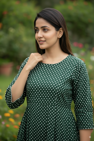 Premium Cotton Kurti with Green Polka Dot Print – 3/4 Sleeve
