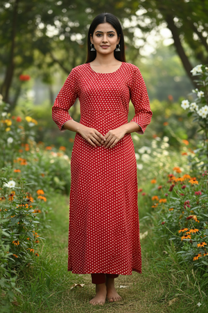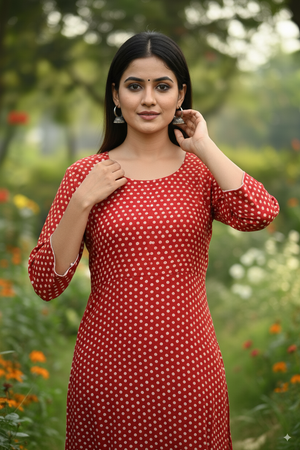 Add a vibrant touch to your collection with the Kushi Premium Cotton Kurti, styled in a bright red shade with classic white polka dots. Made from soft breathable cotton, this kurti features a scoop neckline, 3/4th sleeves, and a flattering A-line cut, making it a perfect choice for office wear, festive gatherings, or casual outings. Pair it with leggings or palazzos for an effortlessly stylish look.