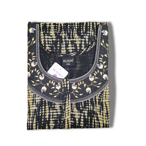 Premium Cotton Nighty – Black with Peach Abstract Print & Embroidered Neckline