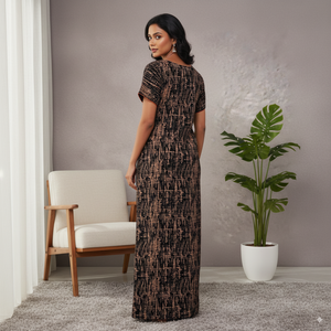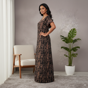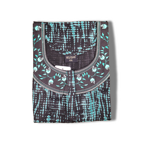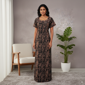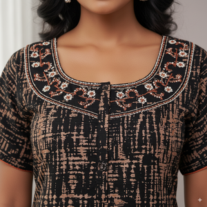 Experience all-day comfort with this premium cotton nighty, featuring a black base adorned with a peach-toned abstract pattern. The neckline is beautifully enhanced with intricate peach floral embroidery on a matching base, complemented by elegant piping. Designed for a relaxed fit, this nighty combines breathable fabric with a chic, timeless style.
