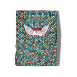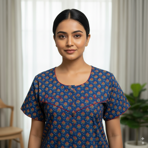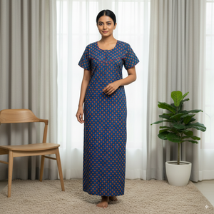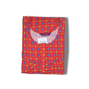 This premium cotton nighty combines comfort with vibrant style, featuring an all-over geometric print in bright red, yellow, and sky-blue accents. The soft, breathable fabric ensures maximum comfort for all-day wear, while the scoop neckline with button detailing adds a touch of elegance. Perfect for daily lounging or nighttime relaxation, this design blends traditional charm with modern patterns.