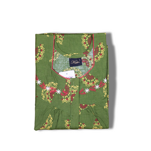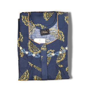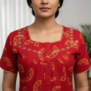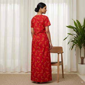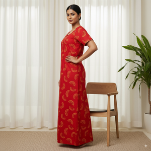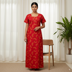 Stay comfortable all day in this premium-cotton nighty featuring a rich red base with mustard paisley motifs. Designed with a neat notch neckline with piping, gentle gathers at the yoke for easy movement, and short sleeves. The relaxed, ankle-length silhouette is breathable, lightweight, and ideal for both home wear and night wear. Easy slip-on style; machine washable for everyday use.