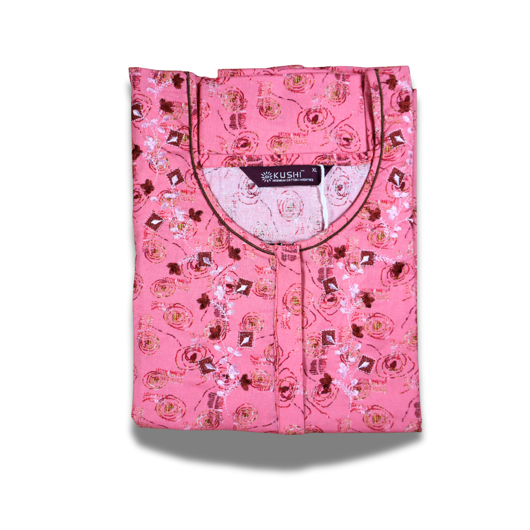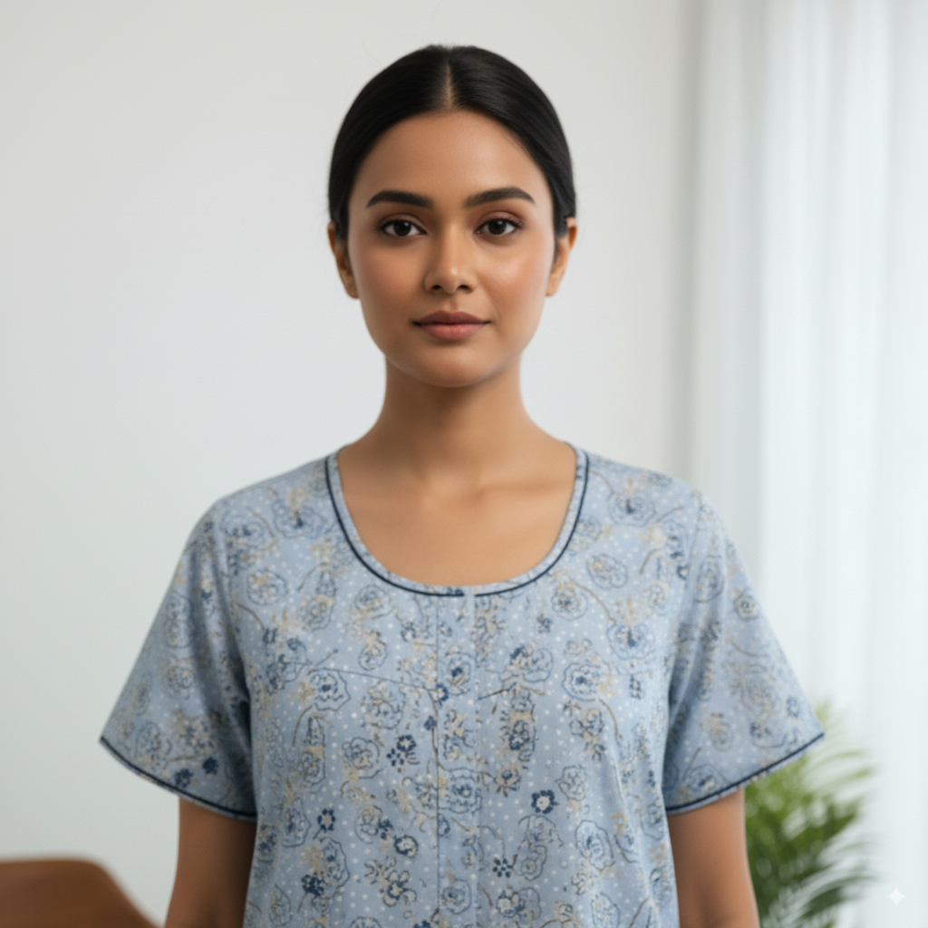 Premium Cotton Printed Blue Nighty for Women – Floral Design with Embroidered Neck