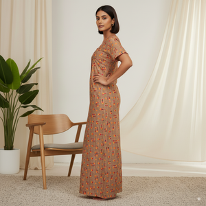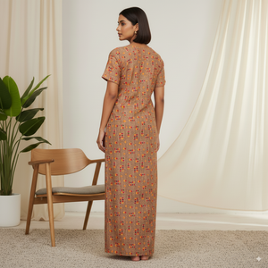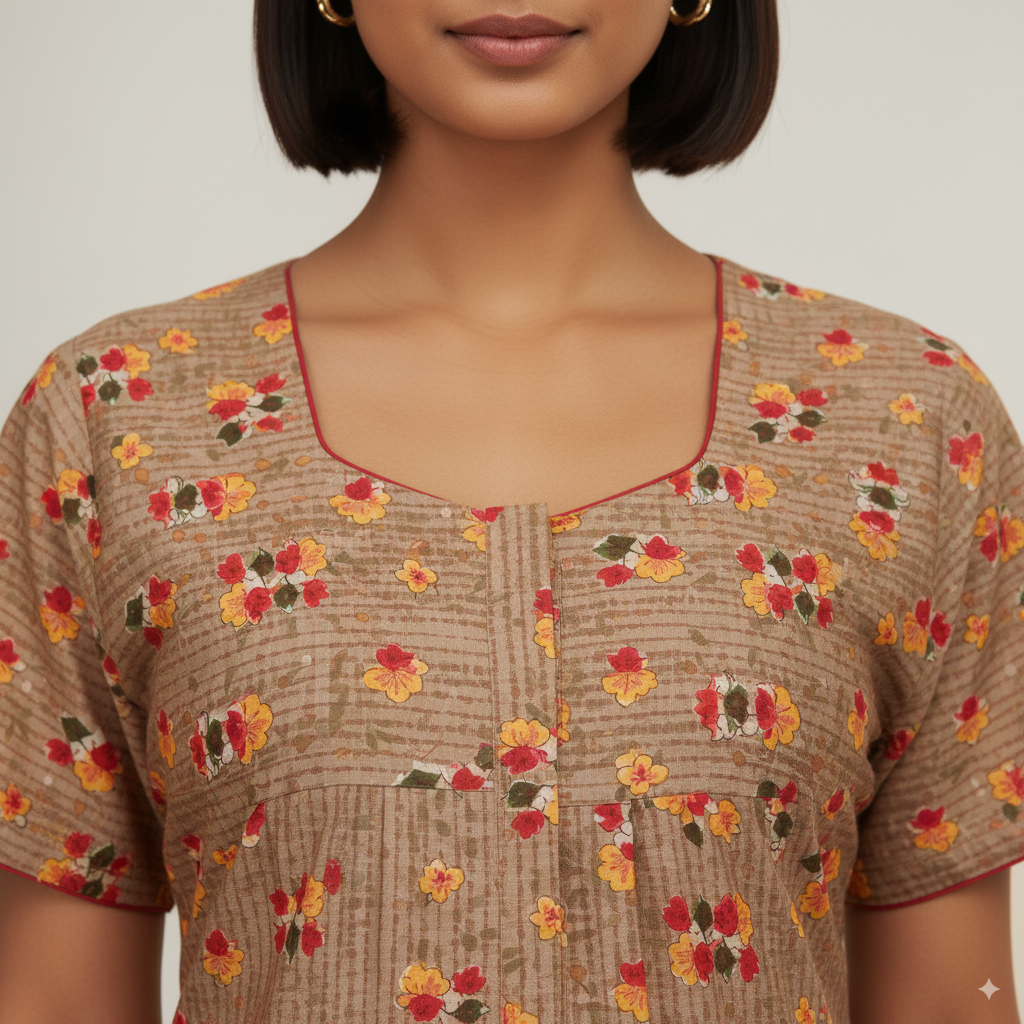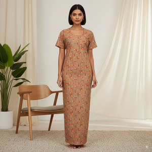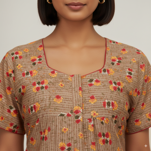 Experience all-day comfort with this premium cotton printed nighty, designed with a soothing beige base adorned with bright red and yellow floral motifs. The breathable cotton fabric ensures comfort in every season, while the straight-fit cut and short sleeves offer easy movement. Perfect for both nightwear and relaxed home wear, this piece combines elegance and practicality.