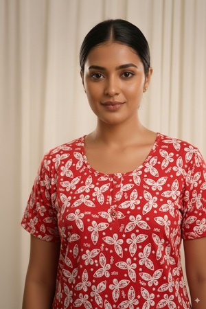 Bright and elegant, this Red Cotton Nighty comes with bold white floral and leaf patterns all over. Made from breathable cotton fabric, it is perfect for everyday home wear and sleepwear.