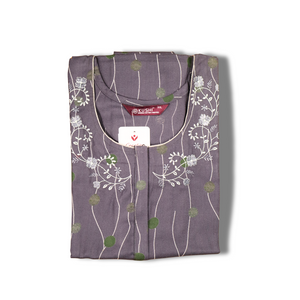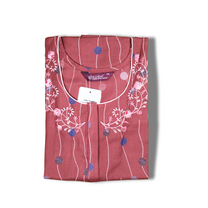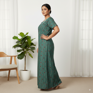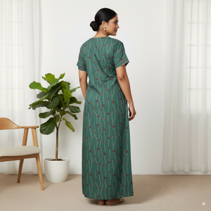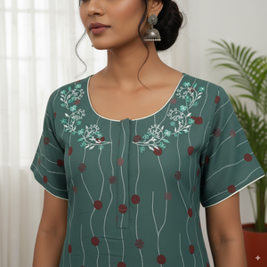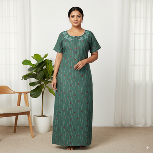 Experience comfort and elegance with this premium nighty, designed in a soothing deep green shade adorned with minimalist vertical wave patterns and maroon floral accents. The neckline features intricate white floral embroidery, adding a touch of grace to your nightwear. Crafted from soft and breathable fabric, this ankle-length nighty ensures all-day comfort, making it perfect for both nightwear and at-home leisure wear.