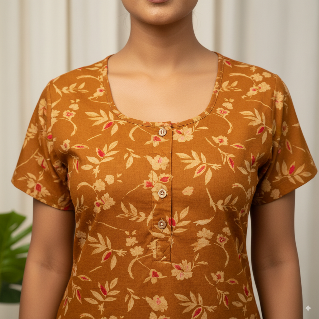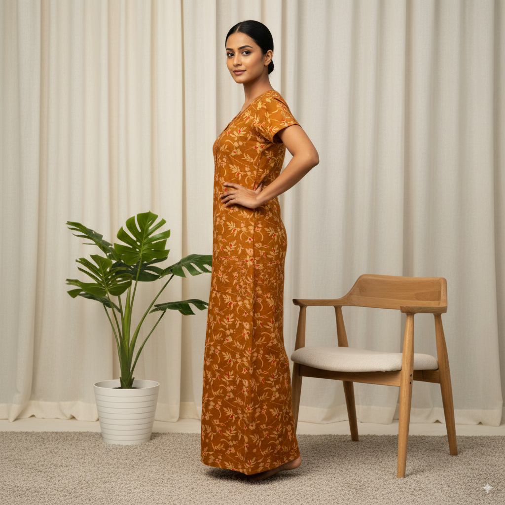 Premium Floral Printed Women’s Nighty – Mustard Brown