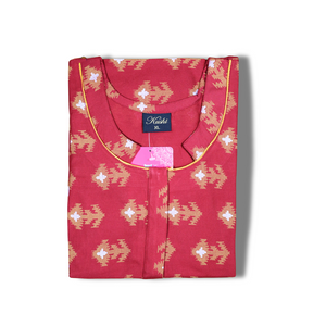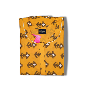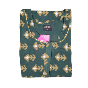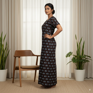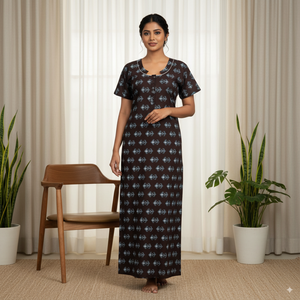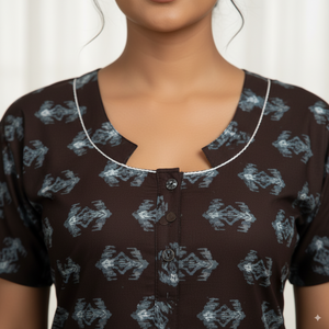 This elegant rayon heavy nighty features a deep brown base with subtle grey ikat-inspired prints all over, giving it a modern ethnic look. The round neckline is finished with a fine light border, adding a neat touch. Crafted from soft and breathable rayon fabric, it ensures maximum comfort, durability, and style for daily wear or evening relaxation.