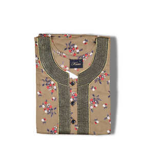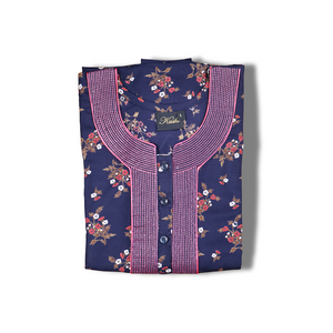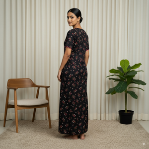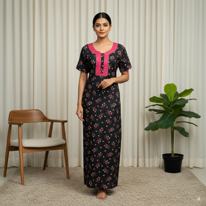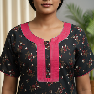 This stylish rayon nighty features a classic black base beautifully adorned with multicolour floral prints, adding a touch of charm and elegance. The neckline is highlighted with a bold pink panel and button-down detailing, giving it a modern and fashionable appeal. Crafted from soft and breathable rayon fabric, it offers all-day comfort, making it perfect for both casual home wear and evening relaxation.