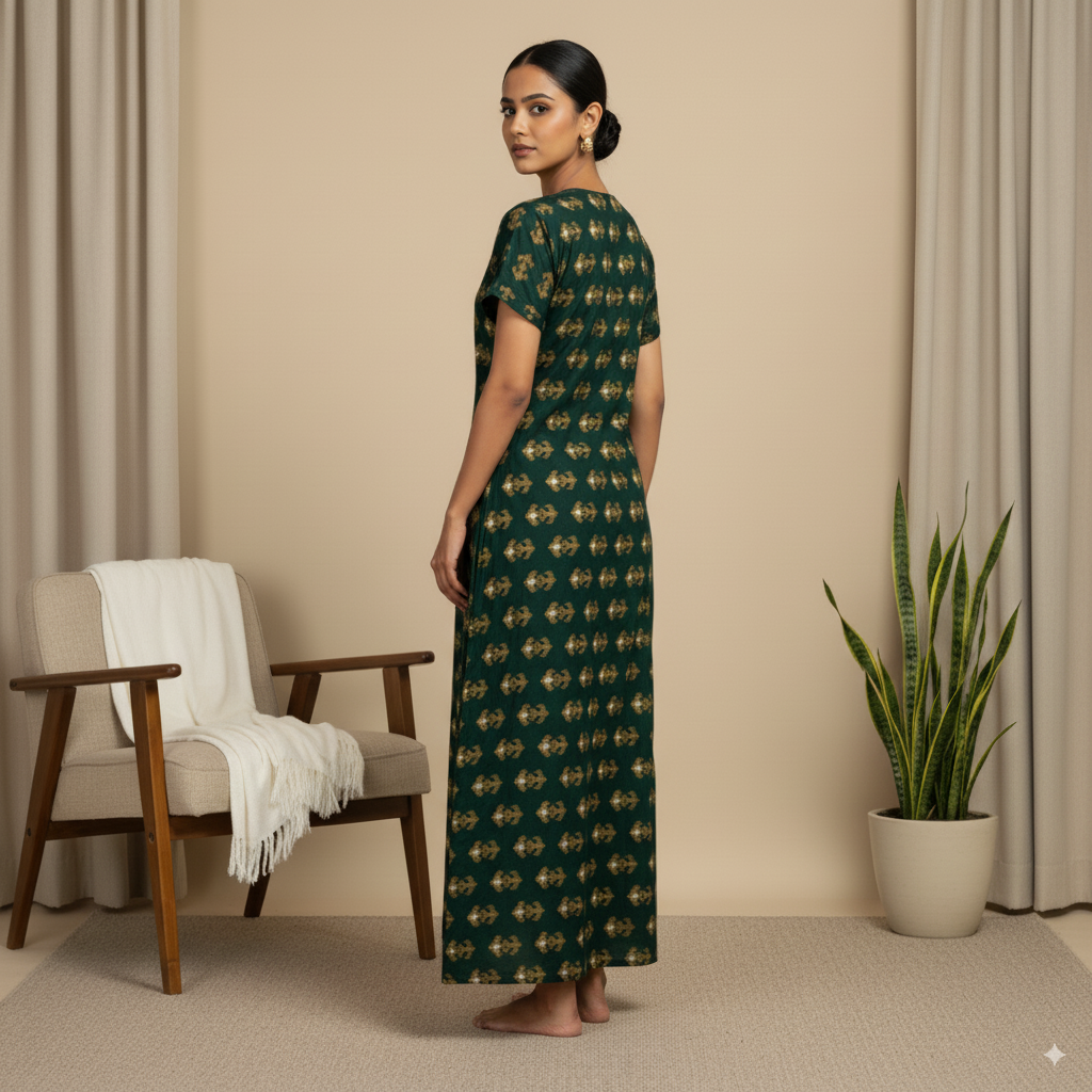 Rayon Nighty – Deep Green with Mustard Ikat-Inspired Print