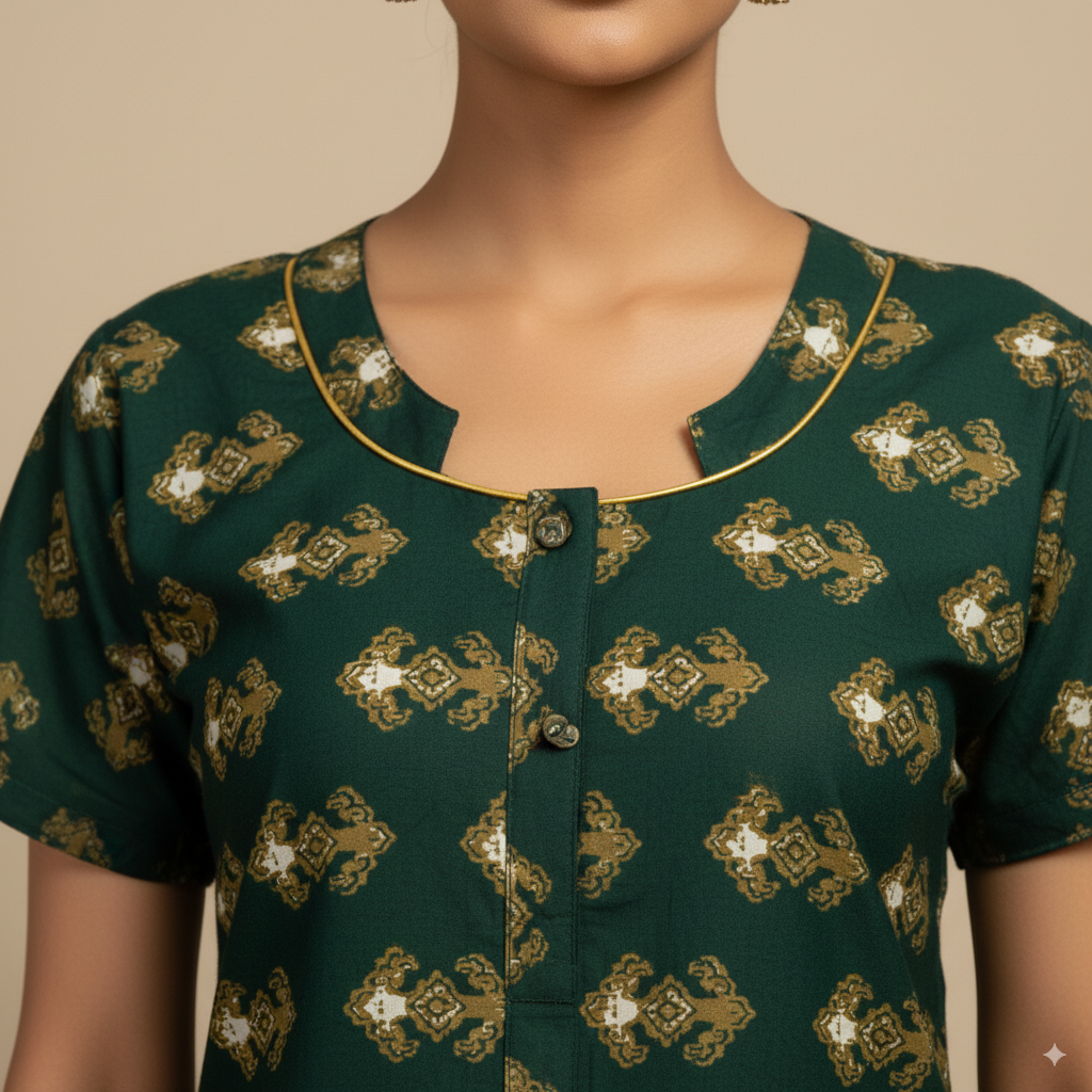 This elegant rayon nighty comes in a rich deep green base decorated with mustard ikat-inspired motifs for a stylish ethnic appeal. The neckline is highlighted with a fine yellow piping that adds a subtle yet attractive contrast. Made from soft and breathable rayon fabric, this nighty ensures superior comfort and durability, making it ideal for everyday wear and evening relaxation.