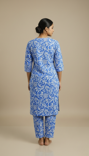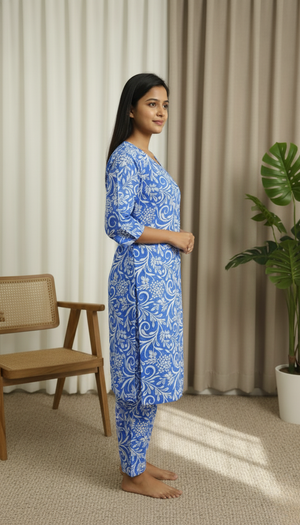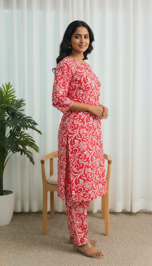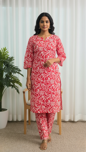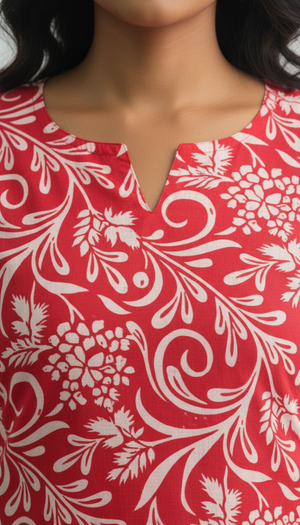 Brighten up your wardrobe with this stunning red cotton kurta set featuring elegant white floral motifs. The kurta is designed with a flattering V-notch neckline and three-quarter sleeves, offering both grace and comfort. Paired with matching printed pants, this ensemble is perfect for casual outings, festive gatherings, or everyday wear. Crafted from breathable and soft cotton fabric, it ensures ease of movement and all-day freshness with a stylish, traditional touch.