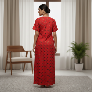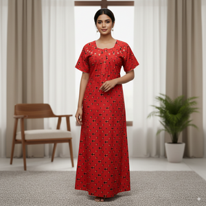 Add charm and comfort to your loungewear collection with this red cotton nighty from Kushi Nighties. Crafted from breathable cotton, it features an all-over geometric floral print in contrasting tones and a beautifully embroidered neckline for an elegant touch. The square neckline, short sleeves, and ankle-length design make it ideal for all-day comfort and night-time relaxation. This nighty combines style and practicality, ensuring you stay comfortable without compromising on elegance.