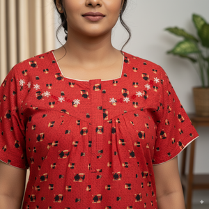 Red Cotton Nighty with Floral Embroidery and Geometric Print