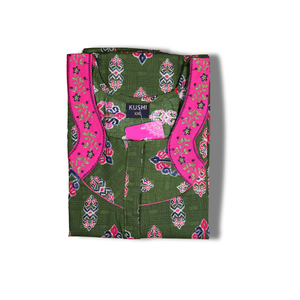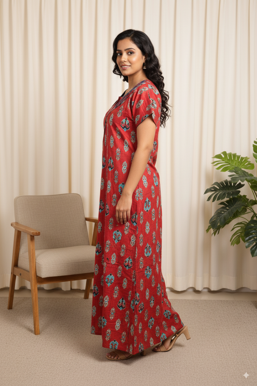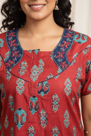 Elevate your everyday comfort with this red cotton nighty featuring a traditional all-over print in blue and beige tones. The design is complemented by a unique contrast blue neckline with embroidery, adding a stylish touch. Crafted from breathable cotton, this nighty ensures comfort all day and night. With its relaxed fit and short sleeves, it is perfect for casual wear and lounging.