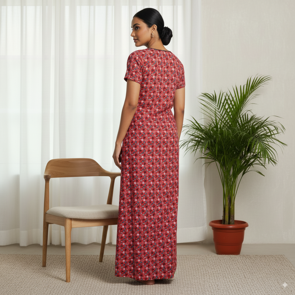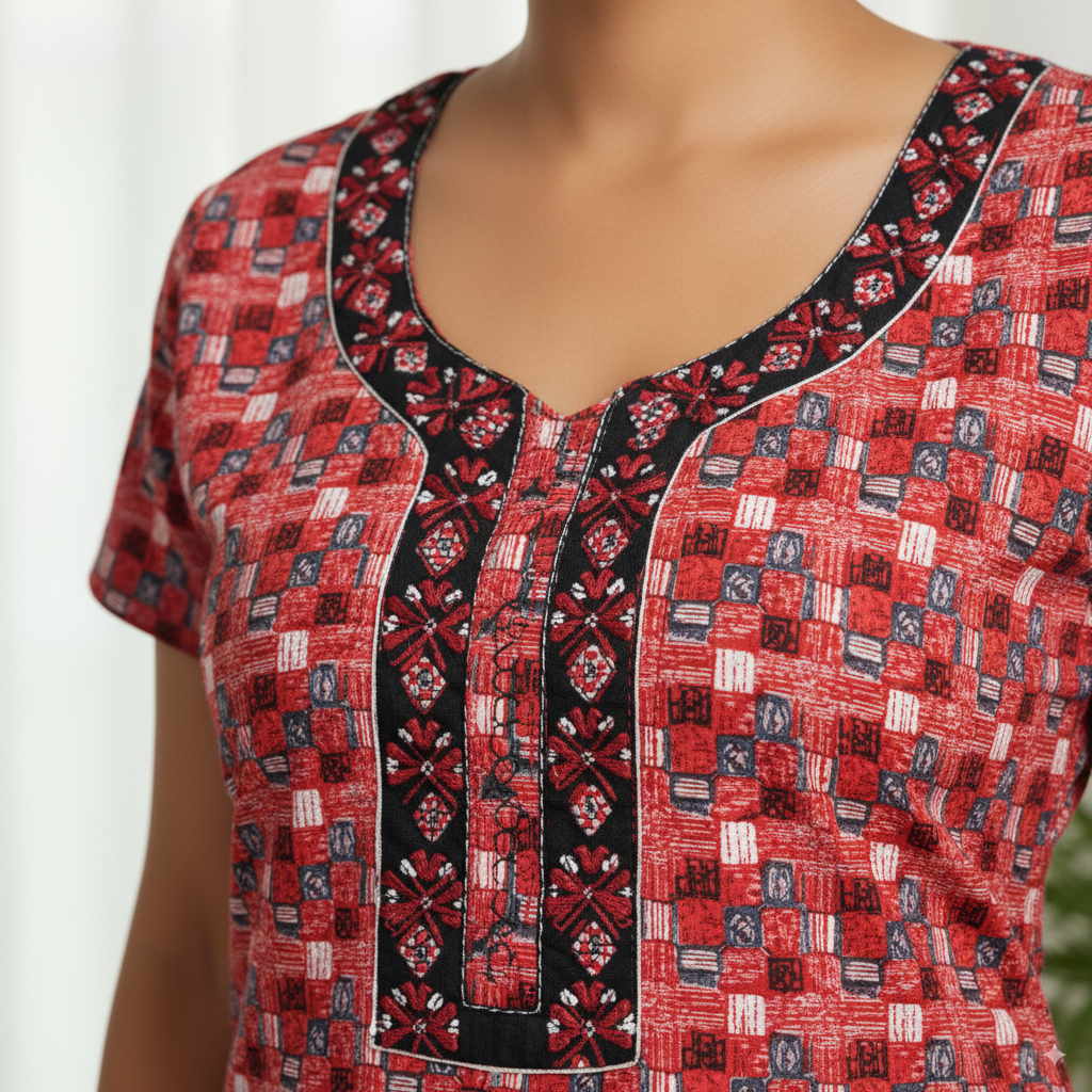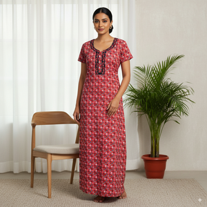 This elegant ankle-length nighty is crafted from soft cotton fabric, featuring a vibrant red base with an all-over floral geometric print. The neckline is designed with a contrasting black yoke, highlighted by delicate multicolour embroidery that adds a touch of sophistication. With short sleeves and a relaxed fit, this nighty ensures both comfort and style, making it perfect for daily wear.