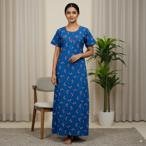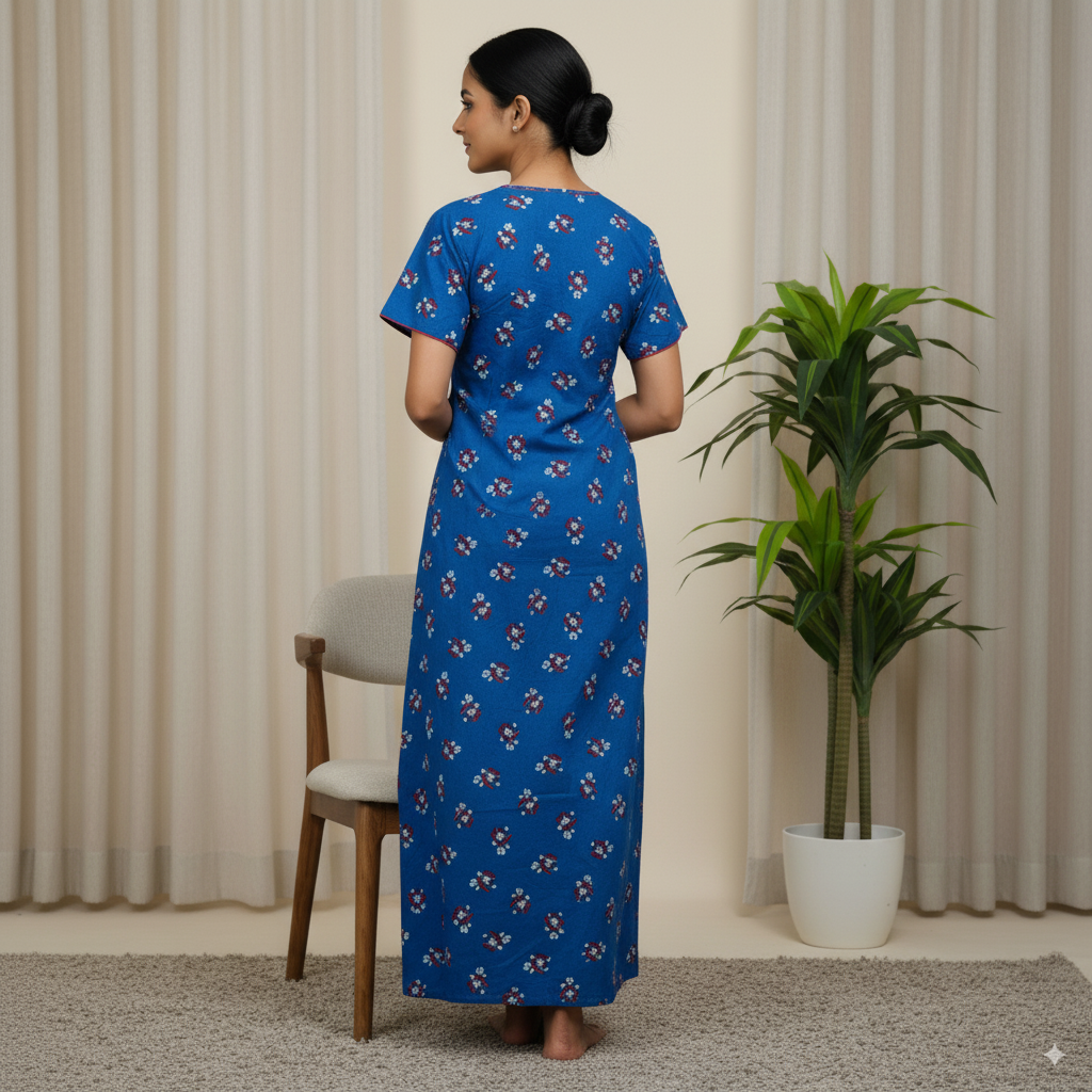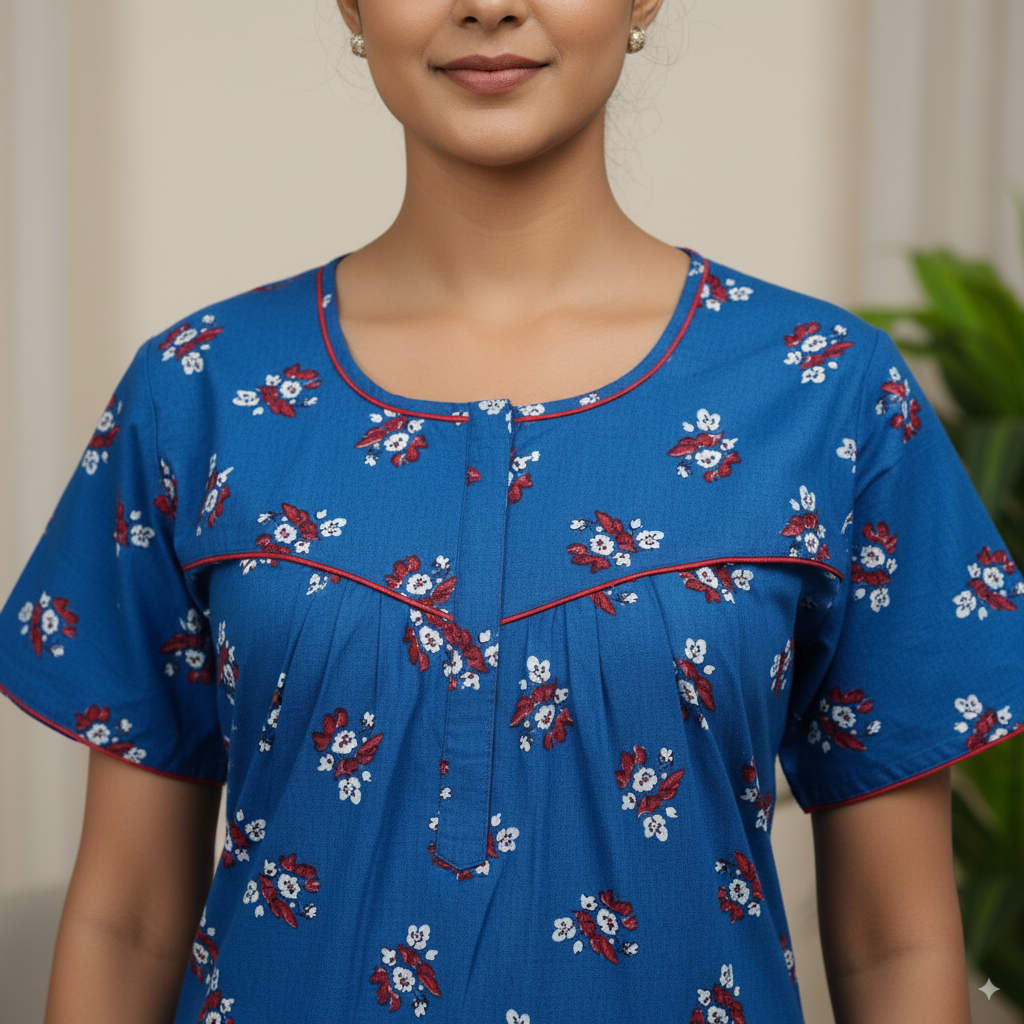 A charming full-length women’s nighty crafted in a vibrant royal blue shade, adorned with an all-over floral print in white and red. The round neckline features a button placket and is accented with contrasting red piping along the edges for a polished finish. Designed with short sleeves and a relaxed silhouette, this nighty offers ultimate comfort and style for everyday home wear and restful nights.