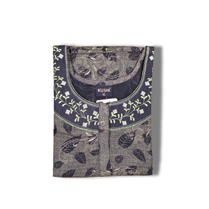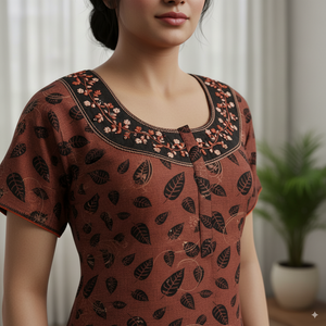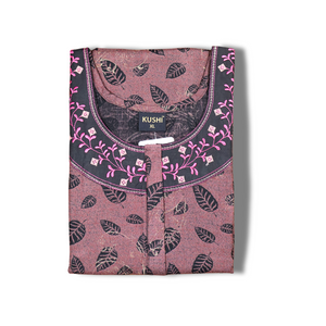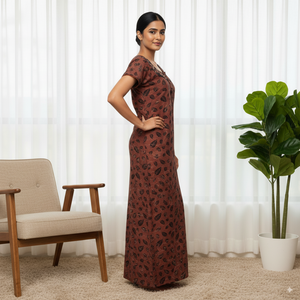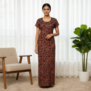 This ankle-length rust brown nighty features a charming all-over leaf print in black and golden accents. The wide, rounded neckline is adorned with intricate floral embroidery in earthy tones, adding a touch of elegance to the casual comfort of the outfit. Short sleeves with matching printed borders complete the look, making it perfect for everyday wear at home. Made from breathable fabric, this nighty combines style and ease for all-day comfort.
