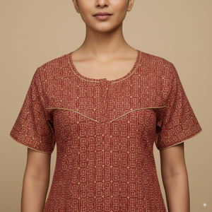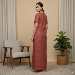 A stylish full-length women’s nighty featuring a rich rust red base adorned with an intricate all-over micro-geometric print in subtle yellow. The round neckline and yoke are enhanced with contrasting yellow piping, adding a refined touch. Designed with short sleeves and a relaxed fit, this nighty ensures breathable comfort and effortless elegance for everyday wear or restful nights.