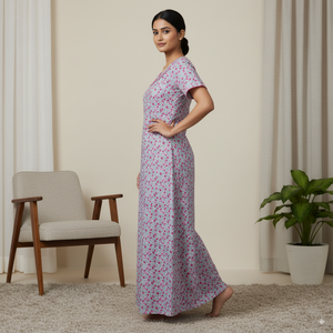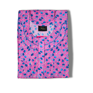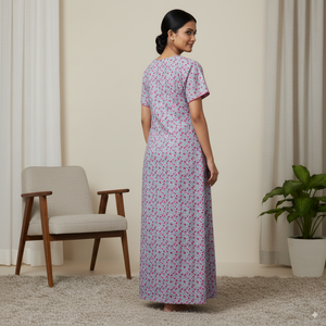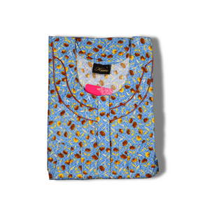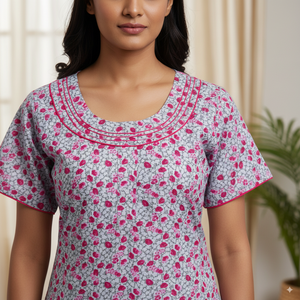 This elegant satin nighty, features a soft sky-blue base adorned with an all-over pink floral print. The neckline has delicate pleating details and contrast finishing, adding to its charm. The fabric is lightweight and comfortable, making it ideal for both nighttime wear and relaxed lounging.