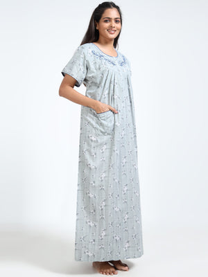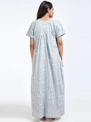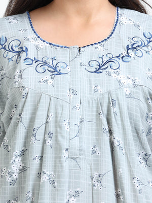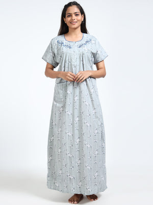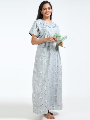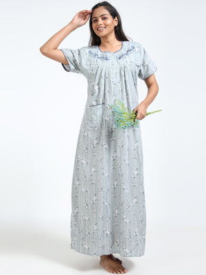 Stay cool and graceful in this breathable grey cotton nighty, featuring a delicate floral print and embroidered neckline—perfect for everyday comfort with a feminine touch.