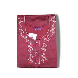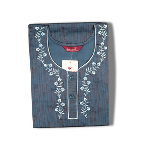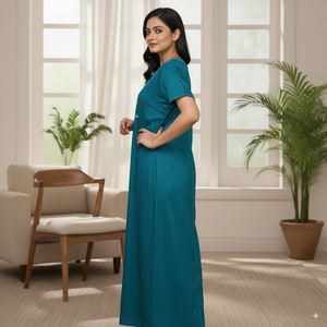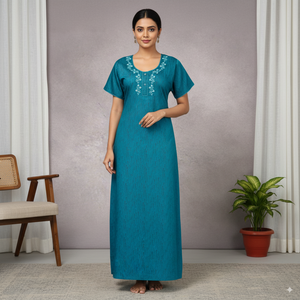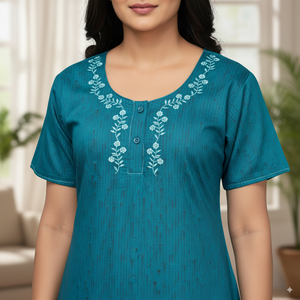This beautiful ankle-length cotton nighty comes in a rich teal blue base, designed with subtle vertical line detailing for a refined look. The neckline is enhanced with delicate floral embroidery in shades of aqua and white, adding a graceful touch. With short sleeves and breathable cotton fabric, this nighty offers both style and all-day comfort, perfect for regular home and nightwear.