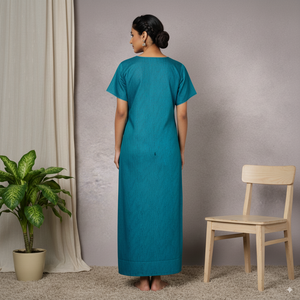 Teal Blue Cotton Nighty with Elegant Floral Neck Embroidery