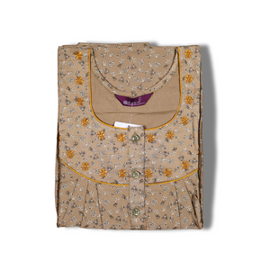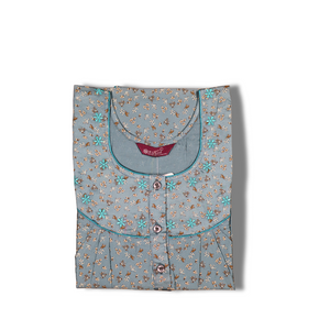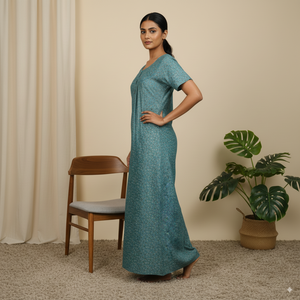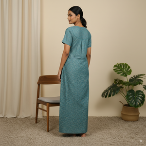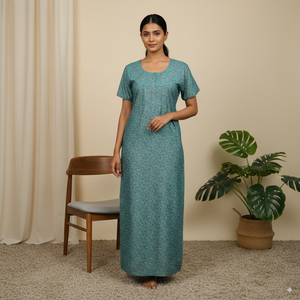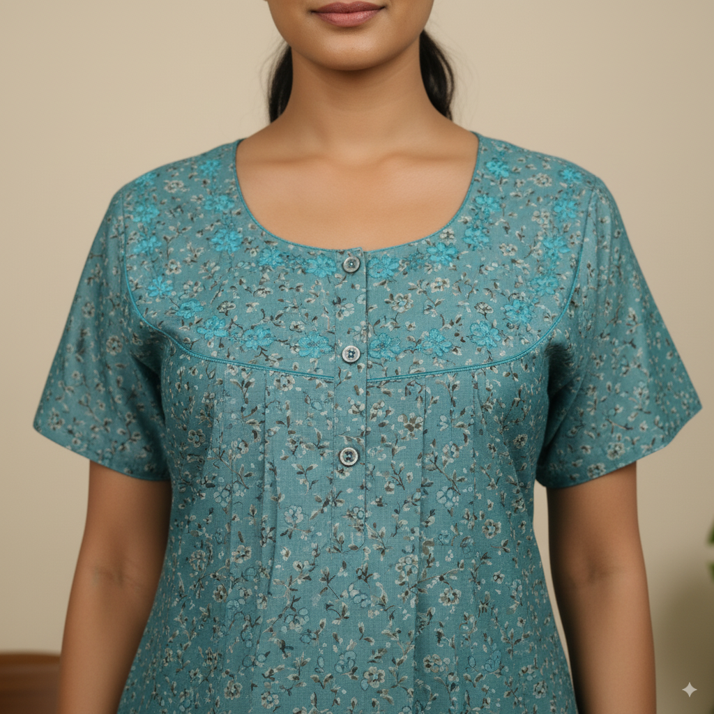 This elegant teal green cotton nighty features a comfortable yoke neck design adorned with small floral prints. The front yoke includes button detailing for a stylish touch, while the loose-fit silhouette ensures maximum comfort for all-day and night wear. Short sleeves and breathable cotton fabric make it perfect for warm weather.