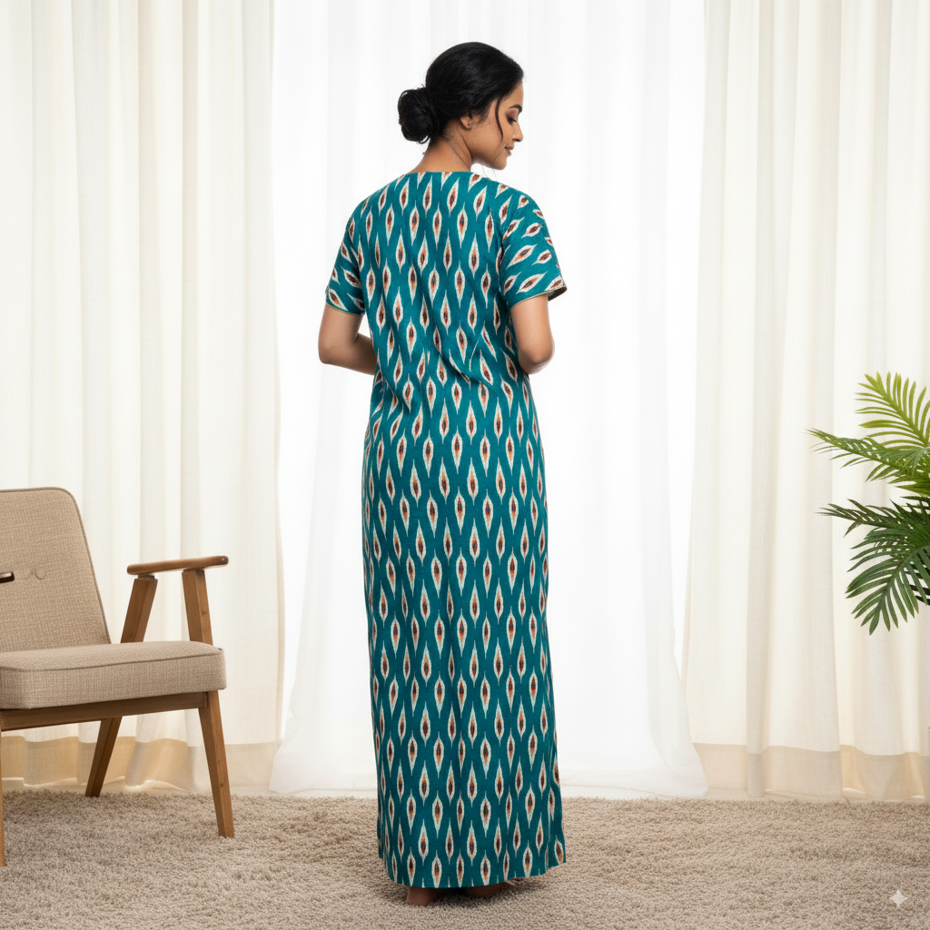 This stunning Teal Ikat Print Kaftan Nightgown brings together comfort and style. The beautiful teal base is adorned with an eye-catching diamond-shaped Ikat print in shades of red, white, and orange, making this gown perfect for both relaxed lounging and a touch of chic homewear. The round neckline features delicate embroidered detailing, adding an extra layer of elegance. With its loose fit and breathable fabric, this ankle-length kaftan is designed for ultimate comfort and a flattering silhouette.