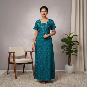 Teal Printed Cotton Nighty with Embroidered Neckline