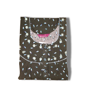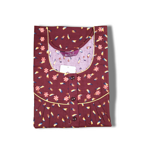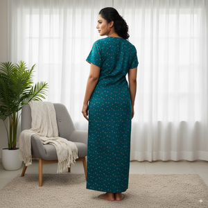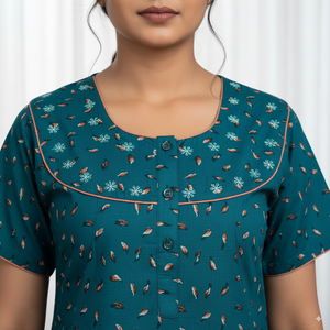 Experience comfort and elegance with this teal cotton nighty from Kushi Nighties. Designed in a soothing teal shade, it features a delicate all-over micro floral print and a beautifully embroidered square neckline with contrast piping. The short sleeves and front button placket add convenience and style, while the ankle-length design ensures full coverage. Perfect for both day and night wear, this nighty offers breathable comfort with a touch of sophistication.