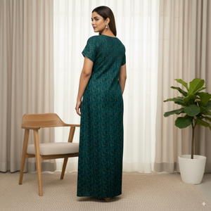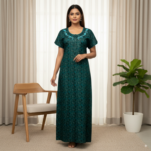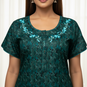 This elegant cotton nighty features a deep green base adorned with a subtle floral print in darker tones, complemented by teal embroidery along the neckline. Designed with short sleeves and a relaxed fit, it offers all-day comfort while maintaining a stylish appearance. The breathable fabric makes it ideal for both casual home wear and nightwear.