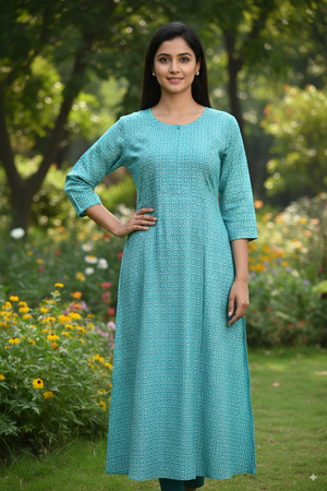 Turquoise blue Cotton Printed Kurti with 3/4th Sleeves
