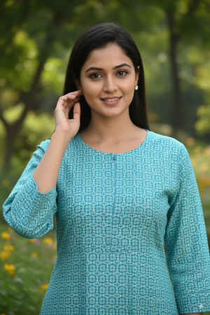 Elevate your everyday style with this elegant turquoise cotton kurti, designed with all-over subtle prints for a chic yet comfortable look. Featuring a round neckline with button detailing, 3/4th sleeves, and a flared hemline, this kurti offers both style and ease of movement. Perfect for office wear, casual outings, or festive gatherings, the breathable cotton fabric keeps you cool and confident all day long. Pair it with leggings, palazzos, or jeans for a versatile look.