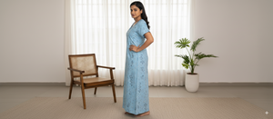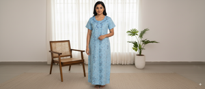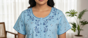 Stay comfortable and stylish in this soft cotton nighty designed in a refreshing sky-blue shade. It features delicate floral prints scattered across the fabric and is beautifully enhanced with rich blue floral embroidery along the neckline. The round neckline with a buttoned placket adds a neat finishing touch. With its breathable cotton fabric and relaxed fit, this nighty is perfect for everyday home wear and bedtime comfort.