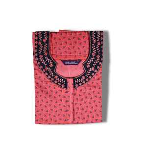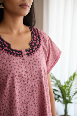 This women’s cotton nighty is crafted for maximum comfort and effortless style. Featuring a soft dusty pink base with delicate printed patterns, it has a relaxed fit and short sleeves for all-day ease. The neckline is designed with a contrasting black patch adorned with intricate pink floral embroidery, giving it an elegant and traditional touch. Perfect for home wear and bedtime, this nighty blends comfort with style.