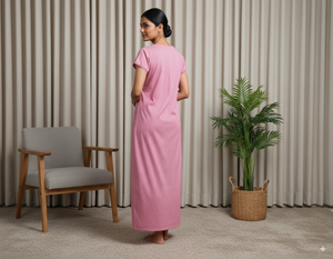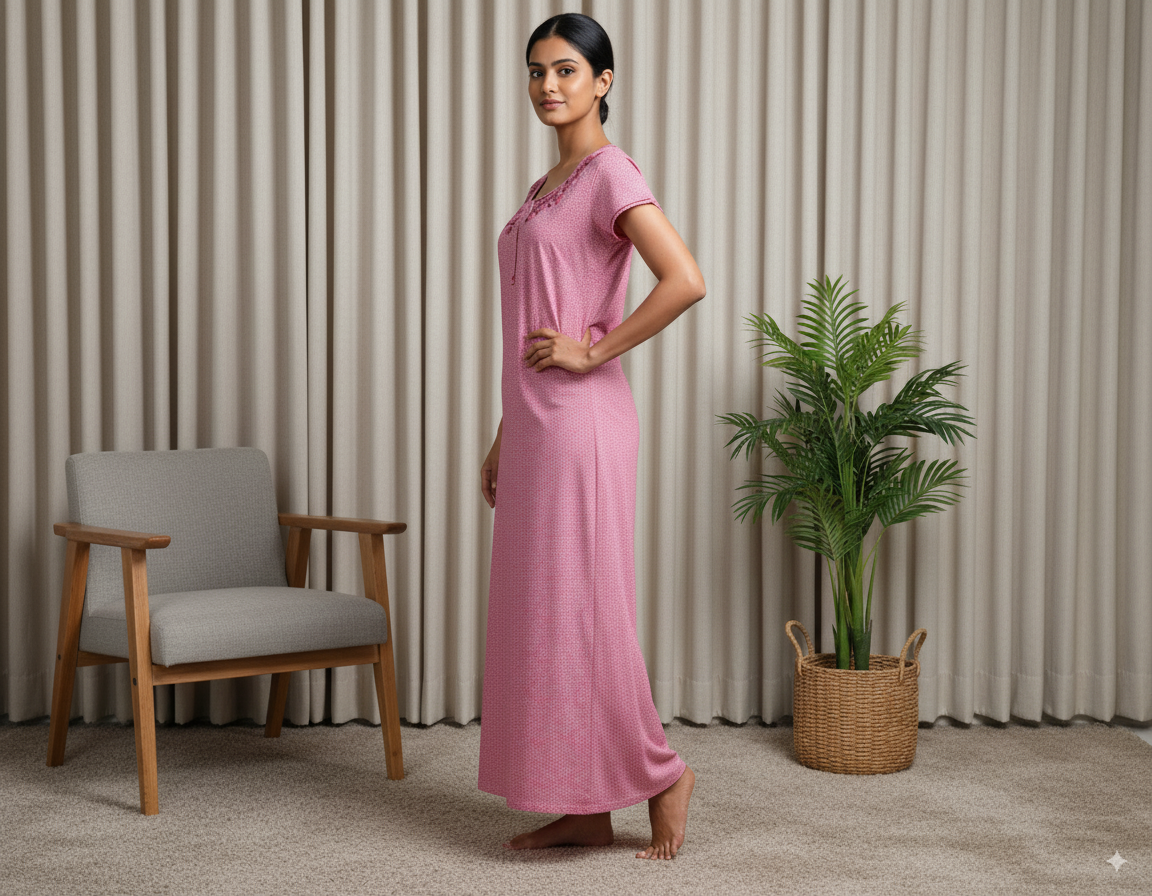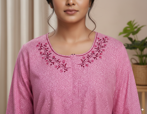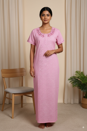 Women’s Cotton Nighty with Floral Neck Embroidery – Pink
