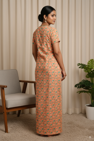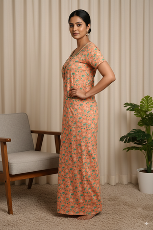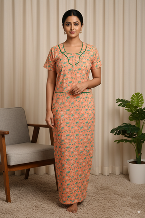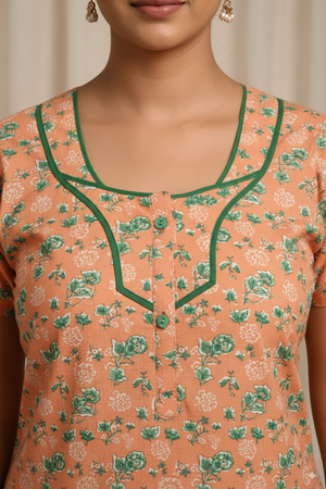 Women’s Cotton Nighty with Green Floral Print & Contrast Neck Design – Peach