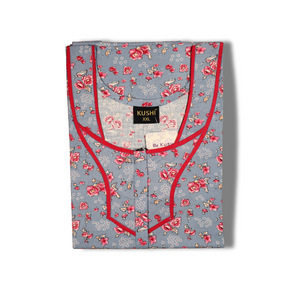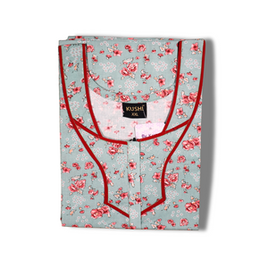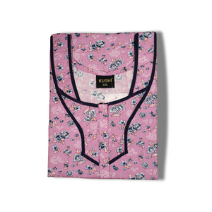 This women’s cotton nighty combines comfort with a fresh, elegant look. The peach-colored base fabric is adorned with a delicate green floral print, creating a lively and feminine appeal. The neckline and pocket are detailed with a dark green contrast piping, adding a stylish touch to the overall design. With short sleeves, a straight fit, and breathable cotton fabric, it is perfect for everyday wear and peaceful nights.