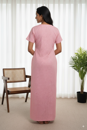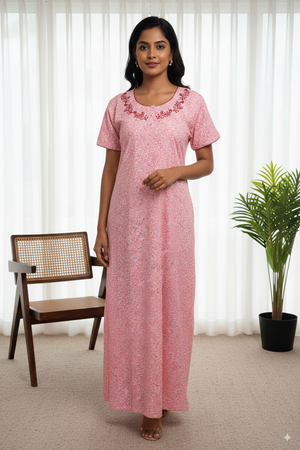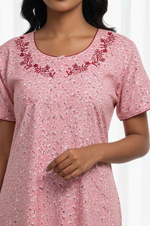 This women’s cotton nighty is crafted in a soft baby pink shade with delicate all-over floral prints. The round neckline is enhanced with elegant red floral embroidery, adding a graceful touch to the simple design. With short sleeves and a relaxed ankle-length fit, it is ideal for comfortable home wear and bedtime use. Made from breathable cotton, this nighty combines everyday comfort with feminine charm.