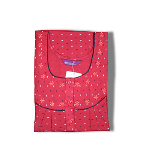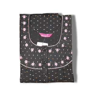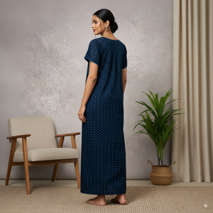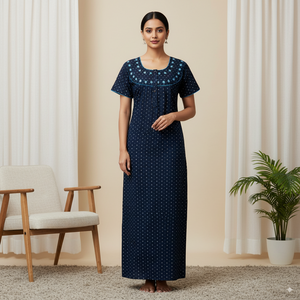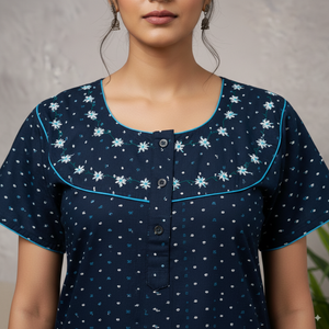 An elegant, ankle-length nighty in deep navy with tiny polka dots. The front yoke features delicate sky-blue floral embroidery and contrast piping, paired with comfortable short sleeves. Made from a soft, breathable cotton-blend for all-day lounge and night wear. Slip-on, relaxed fit.